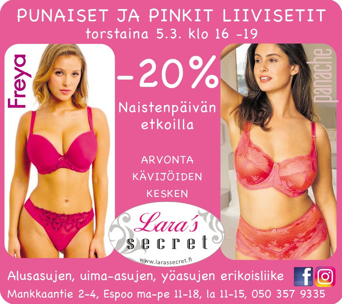 Tervetuloa puotiin! Ohessa uutiskirjeeni - sinulle! Meiltä löytyy eri hintaluokkaan liivejä, karkeasti ottaen alle 100€ ja yli 100€ liivit - yhteistä näille on: LAATU ja palvelu samaan hintaan. Kurkkaa kirje tästä: https://larassecret.creamailer.fi/email/67bd8989600f5?u=1jwdMyLuPbxPuY0JYSALL Terkuin, liivitohtorinne Merja
